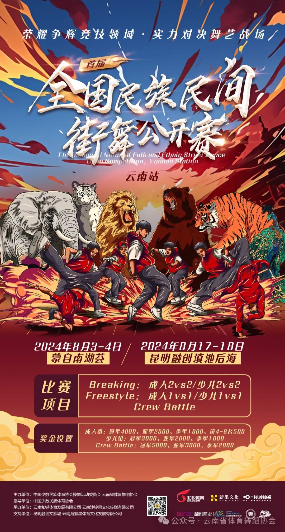 2024 年8月盛夏,一场融合民族民间文化与现代街舞潮流的体育舞蹈盛事——首届全国民族民间街舞公开赛,即将在云南拉开帷幕。本次大赛由中国少数民族体育协会操舞运动委员会、云南省体育舞蹈协会主办,在中国少数民族体育协会指导下,由云南和锐体育发展有限公司、云南沙铃果文化传媒有限公司承办,并得到了昆明融创滇池后海、云南海繁星体育文化发展有限公司、蒙自南湖荟的大力支持。大赛旨在推动民族民间文化与街舞的深度融合,为广大街舞爱好者搭建一个展示自我、交流学习的平台,同时也为民族文化的传承与创新注入新的活力。街舞作为一种源于街头的舞蹈形式,具有极强的活力和创造力。当街舞与民族民间文化相互交融,不仅为街舞注入了深厚的文化底蕴,也为民族民间文化的传播与发展开辟了新的途径。通过将民族民间文化元素融入街舞动作、音乐和服饰中,使古老的民族文化以更加时尚、新颖的方式呈现在大众面前,吸引更多年轻人关注和了解民族文化,激发他们对民族文化的热爱和认同感,从而积极投身于民族文化的传承与发展事业。本次云南赛区的比赛将分为两个阶段进行。第一阶段于 2024年8月3日 - 8月4日在蒙自南湖荟举行;第二阶段于 2024年8月17日 - 8月18日在昆明融创滇池后海精彩上演。 届时,各地的街舞高手将齐聚云南,用充满激情与活力的舞蹈动作,展现民族民间文化与街舞融合的独特魅力,在舞台上展开激烈的角逐。他们将以舞会友,用灵动的舞步和精湛的技艺,诠释对街舞的热爱和对民族文化的敬意。